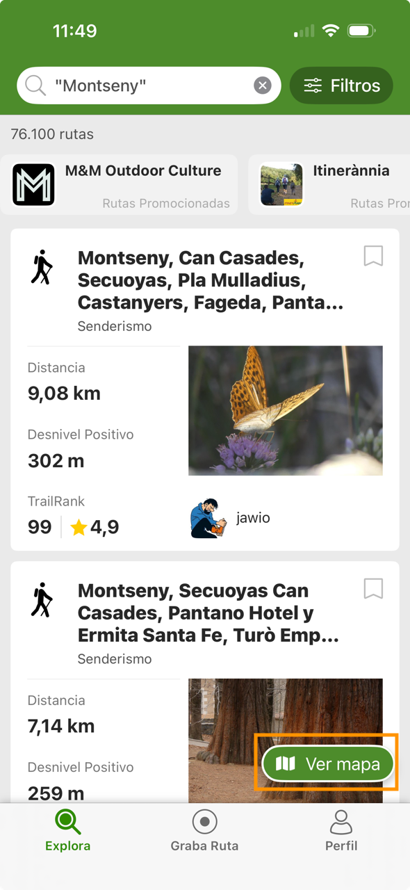 Desde la App tienes la opción de buscar rutas a partir del mapa de búsqueda